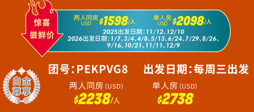 【一價全含】零購物、零自費,全程五星級酒店,優秀中英雙語導遊帶團,景點門票、小費全含,三餐全包(接送機日除外),100%純玩高品質團。